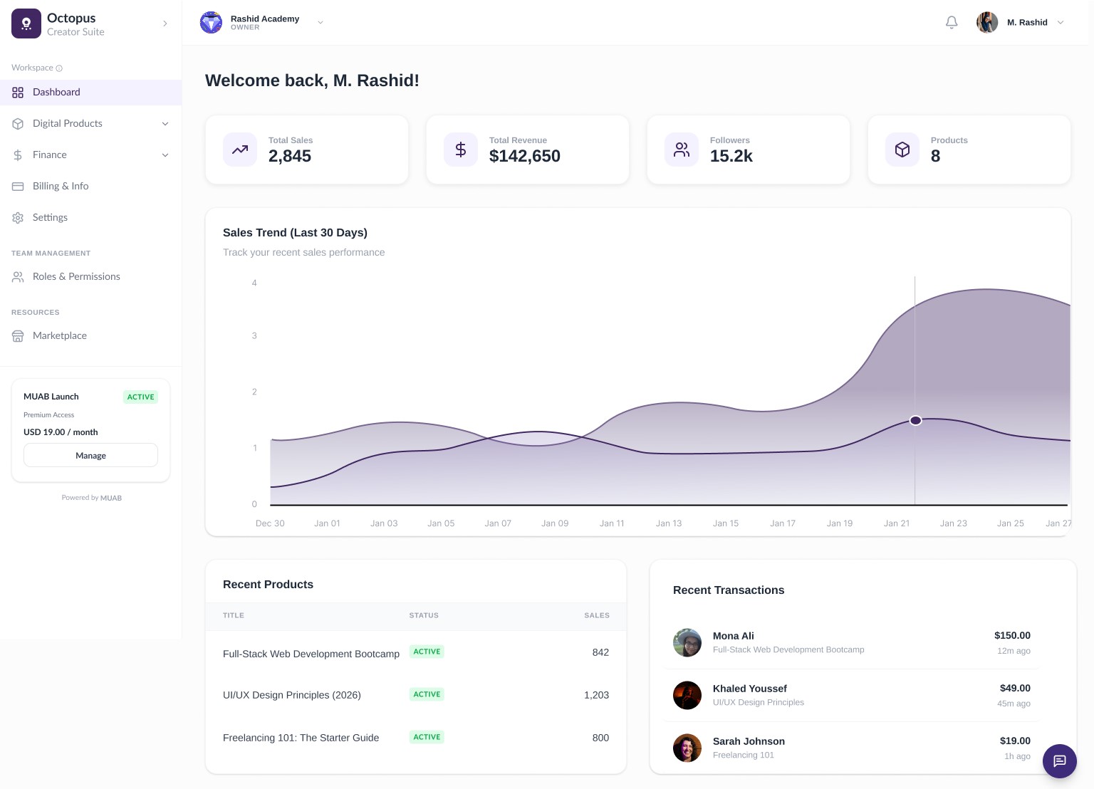 Your learning business becomes easier when everything is connected. The MUAB Octopus System unifies creation, commerce, analytics, community, and operations inside one scalable ecosystem , so every arm works together to help you grow.